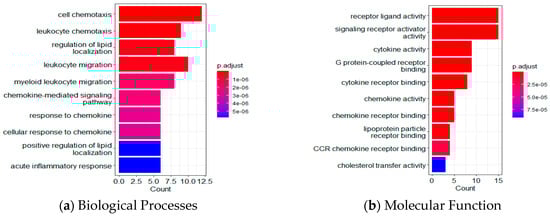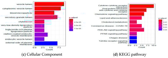 Based on functional enrichment analyses of the 35 LASSO-selected proteomic markers using Gene Ontology (GO) and the Kyoto Encyclopedia of Genes and Genomes (KEGG), Figure 5 shows the top 10 proteins for biological processes (BP), molecular function (MF), cellular component (CC), and KEGG pathway. Table S4 lists the p-values, q-values, and number of involved genes for each pathway. In the BP category, target proteins were mainly involved in cell and leukocyte chemotaxis, regulation of lipid localization, and leukocyte migration. In the MF category, target proteins were primarily involved in receptor ligand activity, signaling receptor activator activity, cytokine/chemokine activity, G protein-coupled receptor binding, and cytokine/chemokine receptor binding. In the CC category, target proteins were mainly distributed in the vesicle lumen, cytoplasmic vesicle lumen, secretory granule lumen, the external side of the plasma membrane, and lipoprotein particles.