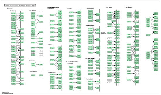 KEGG pathway analysis revealed that several pathways were significantly enhanced, including cytokine-cytokine receptor interaction (KEGG pathway ID: hsa04060, q-value = 9.04 × 10−7, 10 genes, Figure 6 and Table S4), chemokine signaling pathway (q-value = 1.25 × 10−3, 6 genes), viral protein interaction with cytokine and cytokine receptor (q-value = 9.04 × 10−7, 7 genes), as well as lipid and atherosclerosis (q-value = 1.50 × 10−2, 5 genes), along with genes in cholesterol metabolism, PPAR, Toll-like receptor, and HIF-1 signaling pathways.