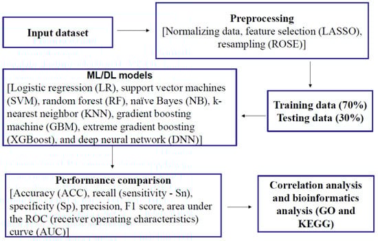 Demographic variables included age, gender, and educational levels. Gender has two levels (male or female). Age and education were continuous variables (years). APOE-ε4 carriers were coded as individuals with at least one ε4 allele (ε4/ε4 designated as APOE-ε4-2, ε4/ε3, or ε4/ε2 as APOE-ε4-1+), while non-carriers were defined as individuals with no ε4 allele (APOE-ε4-0) (Table 1). Biological markers included polygenic hazard score (PHS) [], which is based on AD-associated single nucleotide polymorphisms (SNPs) from previous genome-wide association studies (GWAS) data such as the International Genomics of Alzheimer’s Project and the Alzheimer’s Disease Genetics Consortium. PHS measures an individual’s risk of developing AD based on age and genetic markers. A total of 146 plasma proteomic biomarkers were from an ADNI subset of the dataset “Biomarkers Consortium Plasma Proteomics Project RBM multiplex data”. This study used the ADNIMERGE data, which consist of AD diagnosis, demographic variables, APOE-ε4 genotype, and clinical CSF biomarkers (Aβ42, tTau, and pTau). After merging demographic variables, AD diagnosis, APOE-ε4 allele-containing genotypes, PHS, clinical CSF biomarkers, and proteomic biomarkers, the total sample size was 335, including 96 with AD, 57 with cognitive normal (CN), and 182 with MCI. In the present study, we only analyzed data from MCI and CN individuals. Figure 7 shows the research framework, including data duration, the ML/DL process, correlation analysis, and bioinformatics analysis.