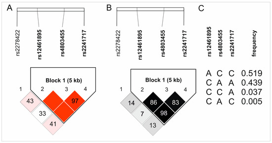 All studied variants of four analyzed TGFB1 SNPs are intronic [25] and follow Hardy–Weinberg equilibrium (HWE), except for rs4803455. Interestingly, in the case of rs12461895 and rs2241717, the alleles defined as minor alleles (MAF) in the European population occurred more frequently in our study group. It should be emphasized, however, that these polymorphisms were still consistent with the HWE. The frequencies of the analyzed polymorphisms and the p-values for the HWE test are presented in Table 1. Moreover, rs12461895, rs4803455, and rs2241717 SNPs were in strong linkage disequilibrium and formed a haplotype. Figure 1 shows the D’ and R2 values from haplotype analyses along with the haplotype frequencies.