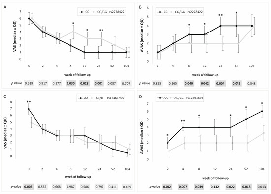 Medians (±QD) of PROM values for carriers of different genotypes. Results for (A) rs2278422 VAS, (B) rs2278422 ΔVAS, (C) rs12461895 VAS, (D) rs12461895 ΔVAS. Legend: QD, quartile deviation; PROM, patient-reported outcome measure; VAS, visual analog scale; * significant difference (p < 0.050); ** statistically important after Hochberg correction (threshold of significance: p ≤ 0.007).