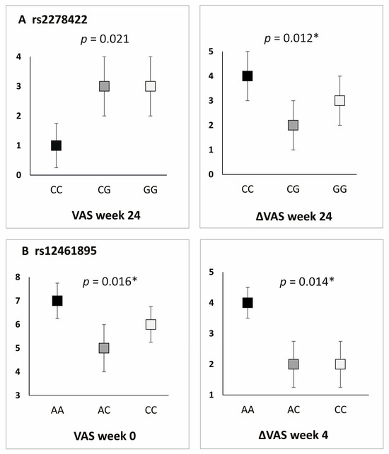 All studied polymorphic variants showed an association with PROM values in the additive model. In the case of rs2278422, CC homozygotes showed lower values of VAS and PRTEE (both at week 24), whereas, for rs12461895, the AA genotype was associated with increased VAS (day 0) and ΔVAS (weeks 2, 4, and 104) (Figure 3). Similar results were obtained for rs4803455 and rs2241717. CC homozygotes were characterized by higher VAS (day 0) and higher ΔVAS (rs4803455 weeks 2–4, rs2241717 week 4). The threshold of significance for multiple testing was assessed as p ≤ 0.016, leaving a statistically significant result for rs2278422 (ΔVAS at week 24) as well as rs12461895 (VAS at day 0 and ΔVAS at week 4) (Supplementary Table S6).