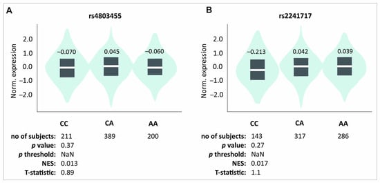 In silico analyses of the effect of (A) rs4803455 and (B) rs2241717 polymorphisms on the TGFB1 gene expression level in whole blood. Figure prepared using GTEx portal data [31].