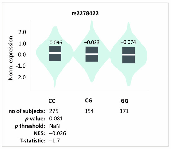 In silico analyses of the effect of rs2278422 polymorphisms on the TGFB1 gene expression level in whole blood. Figure prepared based on GTEx portal data [31].