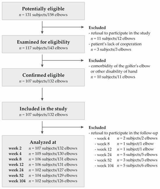 Recruitment of the group of patients eligible for this study was conducted from November 2018 to November 2019, including data collection until November 2021. This study included 107 Polish Caucasian participants from Upper Silesia (132 elbows with 25 bilateral cases). The group consisted of 65 women and 42 men between the ages of 24 and 64 years (median ± QD: 46.00 ± 5.50). All patients were diagnosed with lateral elbow tendinopathy, classified under the ICD-10 code M77.1. The inclusion criteria were tenderness on palpation of the lateral epicondyle, weakness of grip strength, morning stiffness, as well as positive Thomson, Mill, and Cozen tests. Exclusion criteria were the presence of other diseases or injuries (such as rheumatoid arthritis, active cancer, cervical radiculopathy), previous PRP injections, pregnancy, prior surgical treatments, and use of antiplatelet drugs or steroid injections in the last 6 months. Complementary therapies, such as NSAIDs, steroids, physiotherapy, and subsequent PRP injections, were monitored but not considered part of the exclusion criteria. Figure 6 shows the selection of the study group.
