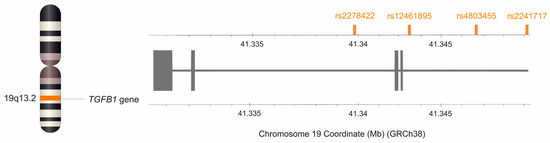 Location of the TGFB1 gene on chromosome 19 and location of the studied SNPs. The figure was created using the data from LD-matrix tool [65].
