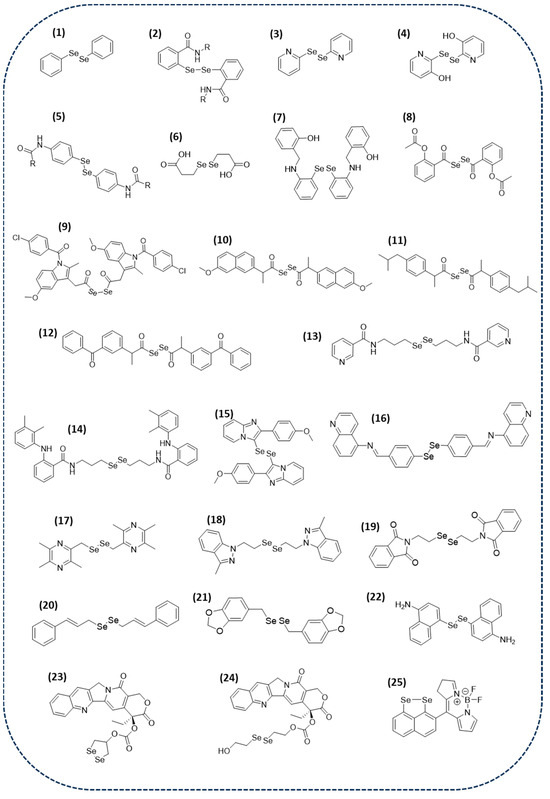 The formation of seleno-prodrugs is a valid strategy for improving the activity of drugs. Particularly, two diselenide prodrugs of camptothecin (23 and 24 in Figure 1), a topoisomerase I inhibitor, have been recently reported. The cytotoxicity of these prodrugs was significantly higher compared to the parent drug. The prodrug activation process led to the generation of -SeOH intermediates, facilitating the continuous conversion of GSH and oxygen into oxidized glutathione (GSSG) and superoxides. The data obtained from this study suggest that the integration a Se-Se bond into a drug may increase the drug’s efficacy [86].