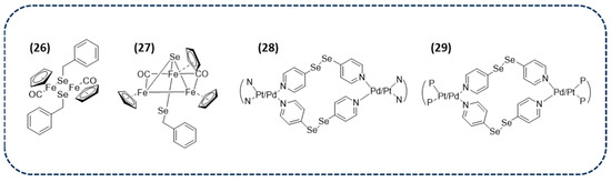 Among them, cyclopentadienyl diiron carbonyl complexes containing selenocompounds as ligands, have recently been synthetized and biologically evaluated for that purpose (26 and 27 in Figure 2). As can be seen in their structure, these complexes have been proposed as carbon monoxide (CO)-releasing molecules that can be used for cancer treatment. The cytotoxicity of both compounds was evaluated via the MTT assay in human breast and colon cancer cell lines, showing that both compounds were cytotoxic with an increased cytotoxic activity with UV radiation in some cases [95].