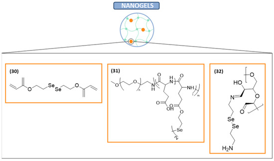 Nanogels are a variety of nanocarriers designed to enhance drug delivery, minimize side effects, and improve tumor chemotherapy [104]. Nanogels are three-dimensional networks formed by the physical or chemical cross-linking of hydrophilic or amphiphilic polymer chains [105]. Recently, a diselenide-cross-linked poly(N-vinylcaprolactam) nanogel co-loaded with gold nanoparticles and methotrexate (30 in Figure 3) was reported as a multifunctional nanoplatform to improve chemotherapy and the imaging of tumors. It has been designed to avoid the toxic effects of chemotherapy and the lack of specificity. This drug delivery system contains diselenide bonds, as they are highly responsive H2O2 in the tumor microenvironment. This diselenide nanoplatform was successfully developed, demonstrating good colloidal stability and adequately releasing gold nanoparticles and methotrexate for the computed tomography imaging of tumors. Furthermore, this nanoplatform has demonstrated to improve tumor chemotherapy through the regulation of the tumor microenvironment via tumor-associated macrophage remodeling, as demonstrated in vivo, where tumor growth inhibition was achieved (relative tumor volume = 5.3). Therefore, this diselenide-containing nanoplatform could be a promising nanomedicine formulation for tumor chemotherapy [106].