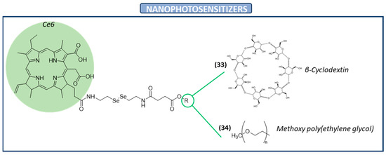 In the absence of light, photosensitizers have a minimal impact on the viability of normal cells since they become active only upon exposure to light, generating ROS and selectively eliminating cancer cells. However, they are normally disseminated through the whole body due to their low specificity against cancer cells. Therefore, novel vehicles are needed to solve this drawback [111]. A recent study has reported chlorin e6 (Ce6) as a nanophotosensitizer against cervical carcinoma cells. In this study, Ce6 was conjugated with succinyl β-cyclodextrin via diselenide linkages (33 in Figure 4). The objective of using a diselenide linkage is based on its ability to be cleaved by ROS in cancer cells. The in vitro results revealed that the cytotoxicity of the nanophotosensitizer was significantly higher than those of Ce6 itself. Furthermore, it was also tested in vivo and the nanophotosensitizer showed a more potent inhibition efficacy than the Ce6 alone. Moreover, this nanophotosensitizer showed a specific delivery capacity and phototoxicity. Due to these facts, this novel nanophotosensitizer of Ce6 is a promising candidate for cervical cancer treatment [112].