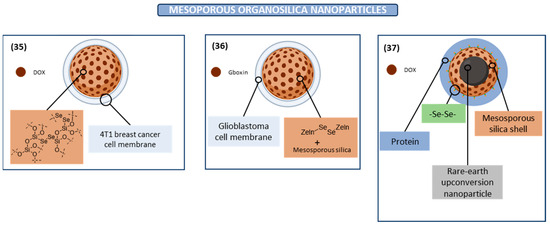 Glioblastoma is the most prevailing primary brain tumor, presenting poor therapeutic prognosis due to factors such as the low rate of drugs crossing the blood–brain tumor barrier, low selectivity, and high toxicity of chemotherapeutic drugs. Interestingly, MONs have also been recently studied in glioblastoma for the purpose of finding an appropriate treatment capable of solving all these impediments. CUDZG, a novel dual-functional nanoparticle for imaging and glioblastoma therapy has been developed. This nanoparticle was formed by Gboxin, a newly developed drug for glioblastoma, and a ZnGa2O4:Cr3+, Sn4+ (ZGOCS)-containing mesoporous silica. Diselenide bonds, particularly diselenide bonds conjugated with zein molecules, are used as bridge in these nanoparticles (36 in Figure 5). The reason for using these diselenide bonds is related to its ability to be reduced to -SeOH by GSH and oxidized to -SeOOH by ROS. Consequently, these diselenide-containing drug carriers can achieve the release of the drug at the tumor site, improving the efficacy and reducing the toxicity of the drug [115]. In view of the application of diselenide-containing MONs as a nanovehicle for the release of drugs, a recent study has reported its application for the release of DOX drugs (37 in Figure 5), showing an inhibitory effect on tumor growth and negligible damage to normal tissues. Hence, they have promising prospects in targeted drug delivery for cancer chemotherapy [116].