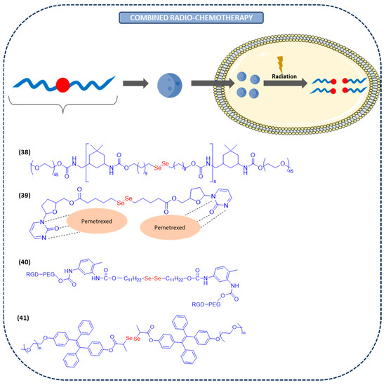 Among the diverse types of nanocarriers for anticancer drug delivery, X-ray-responsive nanocarriers have shown great promise for the efficacy of chemoradiotherapy. Radio- and chemotherapies are the two most common treatments in oncology. By applying both types of therapies, the antitumor efficiency could be reinforced [117]. However, superimposing both treatments to a patient increases the biotoxicity of both, making this combined treatment unacceptable for some patients [118]. Consequentially, radiation-responsive nanocarriers have arisen as a strategy to load and transport anticancer drugs to the tumor site. Among them, diselenide-based nanocarriers have shown excellent biocompatibility and biodegradability. Furthermore, the released products have shown a synergistic antitumor effect and immunomodulatory activity. Recently, a novel drug delivery system based on a diselenide block copolymer as the nanocarrier has been developed (38 in Figure 6). Diselenide linkages can undergo gradual oxidation by H2O2, resulting in the dissociation of the polymer chains and the rupture of the Se nanoparticles. This nanocarrier is not only able to suppress the toxic effects of chemoradiotherapy but also increases the antitumor efficacy [119].
