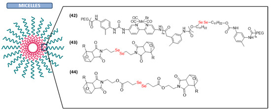 In a similar way, near-infrared (NIR)-responsive interface cross-linked micelles containing the 3,3′-diselanediyldipropionoate cross-linker were prepared for the release of DOX (44 in Figure 7). These DOX-loaded micelles were demonstrated to be pH and NIR-responsive. Furthermore, in vitro toxicity studies revealed that they present a higher antitumor activity toward HeLa cells than to non-cancerous cells. Therefore, these micelles could be used as promising drug delivery systems for cancer treatment [126].