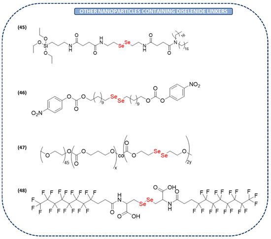 The nanoparticles gathered in the previous section are characterized by the presence of the diselenide bond as part of the core of the nanoparticles (as a linker); these nanoparticles have been used in the vast majority of the studies reported in the last few years, as they serve as efficient delivery vehicles with anticancer efficacy. However, there are some reports of the nanoencapsulation of diselenide-containing compounds. This is the case for DPDSe. As it has been highlighted in the previous section, DPDSe is a known organoselenium compound known for its pharmacological properties, including anticancer properties. Numerous studies have demonstrated that DPDSe exhibits effectiveness against various tumor cells. However, it presents an increased toxicity and physicochemical limitations, including poor aqueous solubility, high Log D values, and elevated plasma protein binding rates. In order to solve these drawbacks and to incorporate it to a topical formulation, DPDSe was encapsulated in nanocapsules (49 in Figure 9). These nanocapsules exhibited higher and more selective cytotoxic effects in malignant melanoma cells than the free compounds (IC50 = 47.43 and 65.05 μM, respectively). Furthermore, their physicochemical properties and chemical stability were improved [134].