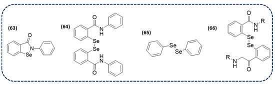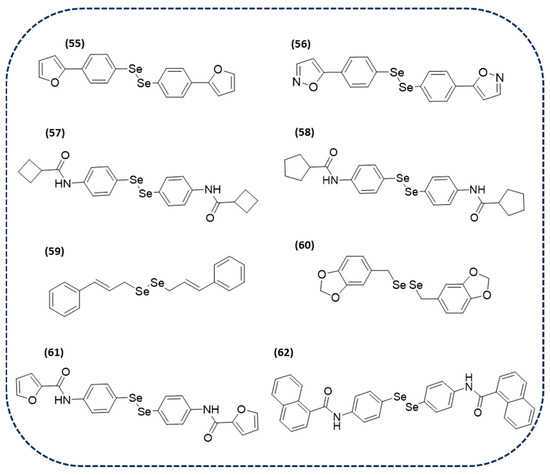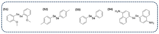 Among the most recent studies of diselenide-containing compounds with antibacterial activity, some compounds have shown a potent antibacterial activity. This is the case for compounds 51–53 (Figure 10). In vitro studies against methicillin-resistant Staphylococcus aureus and Escherichia coli were conducted. The results revealed that the insertion of o-methoxy and p-methyl groups are able to promote changes in mitochondrial functions, which are associated with antibacterial activity. Mechanistically, these compounds are able to produce damage to -SH groups and promote changes in the mitochondrial functions of bacteria. These results bring a new perspective of the mechanism of action of selenocompounds for the development of novel antibacterial drugs [137].