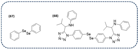 With the objective of improving the activity and properties of DPDSe, a pegylated formulation was developed in order to achieve an intravenous administration of DPDSe for glioblastoma treatment. Polycaprolactone nanocapsules containing the compound and coated with polyethylene glycol (50 in Figure 9) were formed and their cytotoxicity was evaluated. The results revealed that the encapsulated compound presented higher thermal stability, and it was hemocompatible. Furthermore, it had a superior in vitro antiglioma effect in comparison to the free compound (IC50 = 10 μM and 24.10 μM, respectively). Therefore, the suspension of DPDSe-loaded pegylated nanocapsules can be considered a hemocompatible formulation for intravenous glioma treatment. However, its precise role in crossing the blood–brain barrier must be further investigated [135].