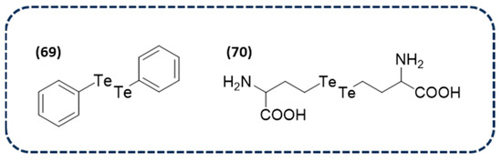 Regarding Te, it is the heaviest non-radioactive member within the chalcogen family. Traditionally, the major use of Te has been in metallurgy as an alloying agent with steel or cooper. However, in the last century, given its unique properties, Te compounds have been applied to other fields such as biomedicine [19]. Unlike the two chalcogens mentioned previously, there are very few examples where Te occurs in living organisms, which could be associated with its toxic effects. These toxic effects depend on the chemical form of Te. The biological chemistry of Te is just emerging [20]. However, during the last couple of decades, some interesting studies have been reported about its application as an element in drug development [21,22,23].