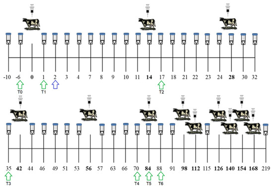Visual representation of rbST time course administration during animal trial (modified from the original work of Lamas and colleagues [23]). The number 0 refers to the day of the first injection (−6 refers to six days before the first rbST administration, etc.). Green arrows represent the sampling point available for miRNA sequencing analysis (T0–T6). Blue arrow represents additional sampling of a single animal from the treated group two days after the first rbST injection.