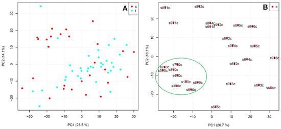 Principal component analysis (PCA) built with relative counting outputs from sequencing data of milk samples collected from experimental animals, considering all rbST-treated (t, blue dots) and control (c, red dots) samples (A), and only control samples (B).