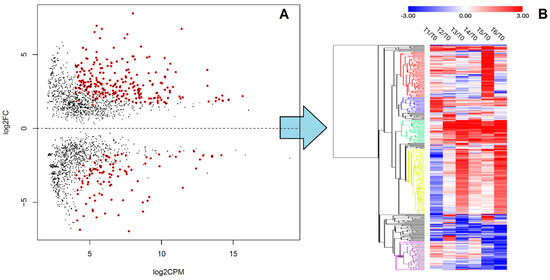- Differential analysis (DESeq2 package) for identification of DE-miRNAs potentially related to rbST exposure, by merging six separate rbST-treated vs. untreated comparisons, considering each sampling times (T1–T6). DE-miRNAs were defined by recorded fold changes (|log2FC| ≥1) and statistical significance (p < 0.05).