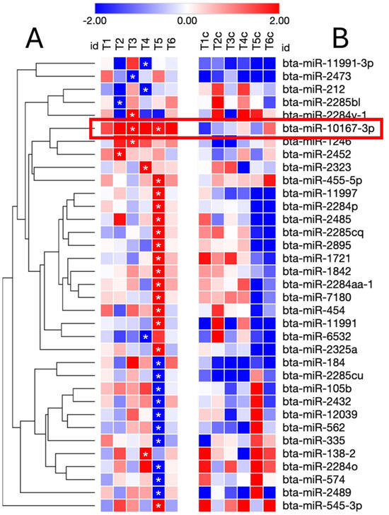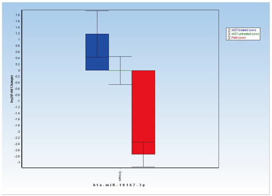 Among the 35 DE-miRNAs identified by applied approach, the bta-miR-10167-3p resulted as constantly overexpressed in rbST-treated dairy cows, at least across the 4 months of lactation considered in the present work.