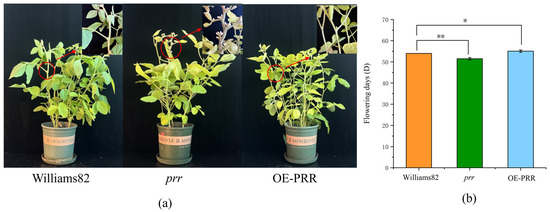 We obtained the Glyma.12G073900 in our preliminary work by obtaining a QTL related to flowering and screening it by localization [33]. To verify the function of Glyma.12G073900, transgentic lines overexpressing (OE-PRR) and gene-edited lines (prr) were obtained by transgenic technology (Figure S1, Table S1). We found that OE-PRR bloomed significantly later than the wild type, while the prr bloomed significantly earlier than the wild type (Figure 1), indicating that Glyma.12G073900 overexpression delayed flowering, while Glyma.12G073900 loss-of-function accelerated flowering time. This result suggests that Glyma.12G073900 functions as a floral repressor in soybean under standard growth conditions.