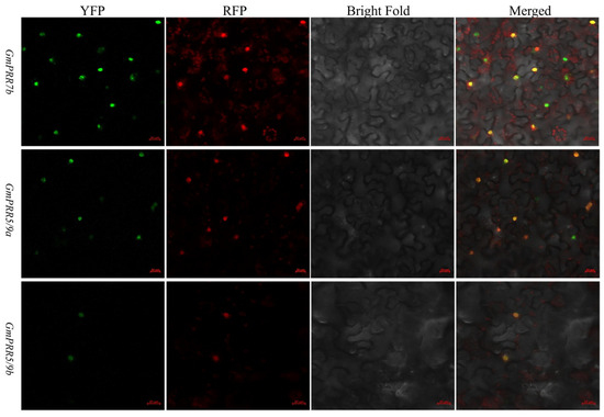 Subcellular localization. Transient expression of pEarleygate104-GmPRR7b, pEarleygate104-GmPRR5/9a, pEarleygate104-GmPRR5/9b, and PC1302-RFP-PIP2 fusion proteins in tobacco; green indicates the fluorescent colour of YFP, red indicates the fluorescent colour of RFP, and yellow indicates the fluorescent colour of YFP and RFP complexed out (bar = 20 μm).