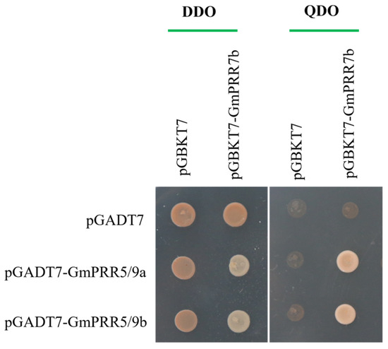To test the above-stated, we selected GmPRR5/9a and GmPRR5/9b, which peaked after GmPRR7b, for yeast two-hybrid verification based on the order of expression. We first performed subcellular localization verification experiments on these three proteins (Figure 3). The results showed that all three proteins were localized in the nucleus, consistent with the previous prediction. On a high-stringency quadruple drop-out medium (QDO plate), the GmPRR5/9a and GmPRR7b plate grew white colonies, as did the GmPRR5/9b and GmPRR7b plate, indicating that both GmPRR5/9a and GmPRR5/9b interact with GmPRR7b at the protein level in yeast (Figure 4).