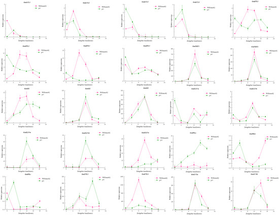 Due to the rhythmic expression characteristics of the PRR gene family, we tried to find the rhythmic expression pattern of GmPRRs as follows (Figure 2): We found that members of the gene family are characterised by rhythmic expression, and GmPRR5/9s appear to be classified into three groups based on the timing of expression, in Williams 82. GmPRR5/9c, GmPRR5/9d, GmPRR5/9e, GmPRR7b, and GmPRR7d were the first to reach peak expression at ZT8, then GmPRR7a; and GmPRR7c showed peak expression at both ZT8 and ZT12. Other PRR genes (GmPRR5/9a, GmPRR5/9b, GmTOC1a, GmTOC1c, GmTOC1d) basically reached peak expression at ZT12, and GmPRR5/9f and GmTOC1b were the latest, reaching peak expression at ZT16. In prr material, GmPRR5/9f was the first to reach peak expression at ZT0; GmPRR7a and GmPRR7b attained high expression at ZT4, followed by GmPRR5/9c, reaching peak expression at ZT10, and GmPRR5/9d reached a high expression, from ZT8 to ZT12, while the remaining genes reached peak expression at ZT12. These results suggest that PRR genes not only exhibit rhythmic expression but also may interact with one another within the gene family to respond to the light signal [9,10,11,12,13,14].