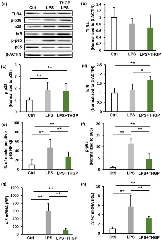 Using macrophage-like differentiated THP-1 cells, we investigated the p38–NF-κB signaling pathway, which is a major inflammatory signaling pathway that is activated by LPS stimulation. First, we examined the expression of TLR4, which is the receptor for LPS, and the phosphorylation of p38 (Figure 1a–c). LPS stimulation did not alter Toll-like receptor 4 (TLR4) expression, and THGP had no effect on TLR4 levels (Figure 1b). Additionally, LPS stimulation increased phosphorylated p38 MAPK (p-p38) levels by approximately two-fold; however, THGP did not suppress p-p38 activation (Figure 1c). In contrast, the nuclear translocation of NF-κB downstream of p38 was significantly affected. Initially, LPS stimulation increased the expression of IκB 1.7-fold (Figure 1d). Furthermore, LPS stimulation increased the proportion of cells with nuclear NF-κB from 10% to 47%, whereas this proportion was reduced to 27% by THGP treatment (Figure 1e). Since NF-κB functions as a transcription factor after its nuclear translocation and phosphorylation, we evaluated p-p65 levels by western blotting. LPS stimulation increased p-p65 levels by 11.3-fold, and THGP treatment suppressed this increase by approximately 37% (Figure 1f). Finally, we analyzed the mRNA expression of IL-6 and TNF-α, which are target genes of NF-κB, by RT-PCR. Compared with that of the control, LPS increased IL-6 expression by 600-fold, whereas THGP suppressed this increase to 110-fold (Figure 1g). Similarly, TNF-α expression increased 5.7-fold with LPS stimulation, and this effect was suppressed to 3.3-fold by THGP (Figure 1h). These results indicate that THGP suppresses LPS-induced inflammatory responses by inhibiting IκB degradation and NF-κB nuclear translocation.