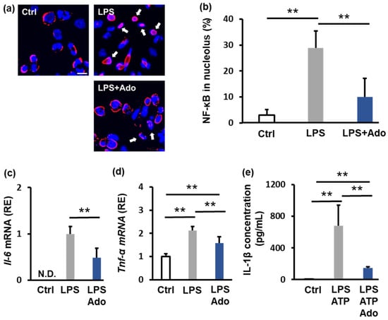 Adenosine is known to have anti-inflammatory properties; therefore, we examined the effect of 100 μM adenosine on NF-κB nuclear translocation. Adenosine suppressed the LPS-induced increase in nuclear localization of NF-κB from 30% to 10% (Figure 2a,b). Furthermore, adenosine suppressed the LPS-induced increase in the mRNA expression of the IL-6 and TNF-α by approximately 50% and 25%, respectively (Figure 2c,d). We also evaluated the level of secreted IL-1β. LPS and ATP stimulation increased IL-1β secretion from 7 pg/mL to 678 pg/mL; however, adenosine decreased IL-1β secretion to 184 pg/mL (Figure 2e). These findings demonstrate that adenosine effectively suppresses inflammation.