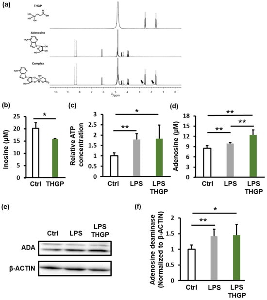 Effect of THGP on adenosine degradation. (a) 1H-NMR analysis of THGP–adenosine complex formation. The black arrows indicate signals corresponding to the complex. The left diagram shows the chemical structures of THGP, adenosine, and their complex. (b) Measurement of inosine levels produced by adenosine-degrading membrane proteins extracted from THP-1 cells. Quantification of ATP (c) and adenosine (d) levels in THP-1 cell culture supernatants after LPS (10 μg/mL) stimulation and THGP (5 mM) treatment. (e) Western blot analysis of adenosine deaminase (ADA) expression under the same conditions. (f) Quantification of the band intensities from (e), normalized to those of β-actin. The results are shown as the means ± SDs (n = 3‒6). * p < 0.05 and ** p < 0.01 compared with the control.