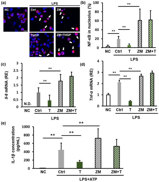 We investigated the role of adenosine signaling in the anti-inflammatory effects of THGP by administering ZM 241385, which is an antagonist of the A2 receptor (adenosine receptor). LPS stimulation increased the nuclear localization of NF-κB to 20%, and ZM 241385 further increased this localization to 60%. However, when both THGP and ZM 241385 were administered, the inhibitory effect of THGP on NF-κB nuclear translocation was reversed (Figure 4a,b). Similarly, ZM 241385 reversed the suppressive effects of THGP on LPS-induced IL-6 and TNF-α mRNA expression (Figure 4c,d). Furthermore, we assessed the levels of secreted IL-1β using an ELISA. LPS and ATP stimulation increased IL-1β secretion from 7 pg/mL to 445 pg/mL. THGP reduced this secretion to 159 pg/mL. However, ZM 241385 increased IL-1β secretion to 723 pg/mL, and cotreatment with THGP and ZM 241385 abolished the suppressive effect of THGP on IL-1β secretion (Figure 4e). These results indicate that the anti-inflammatory effects of THGP are mediated by adenosine signaling. Thus, by forming a complex with adenosine, THGP inhibits adenosine degradation and suppresses inflammation.