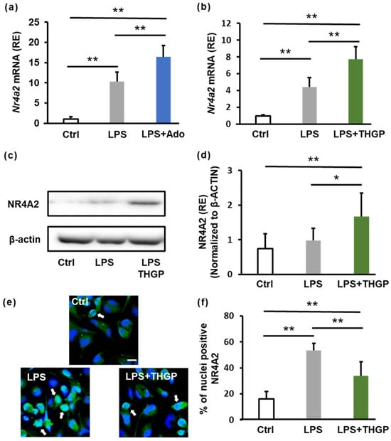 Changes in NR4A2 expression induced by adenosine or THGP. THP-1 cells were seeded and treated with 1 μM PMA for differentiation. After 24 h, the cells were treated with 5 mM THGP. An additional 24 h later, 10 μg/mL LPS was added. The cells were then incubated for another 24 h, after which samples were collected. (a) qPCR analysis of NR4A2 mRNA expression in THP-1 cells treated with LPS (10 μg/mL) and adenosine (100 μM). (b) Similar analysis after THGP (5 mM) treatment. (c) Western blot analysis of NR4A2 protein expression following THGP treatment. (d) Quantification of the band intensities from (c) normalized to those of β-actin. (e) Images of immunofluorescence staining showing NR4A2 localization (green) and nuclei (blue). Scale bar: 20 μm. The white arrows indicate NR4A2 localized in the nucleus. (f) Quantification of the nuclear NR4A2 ratio. The results are shown as the means ± SDs (n = 6). * p < 0.05 and ** p < 0.01 compared with the control.