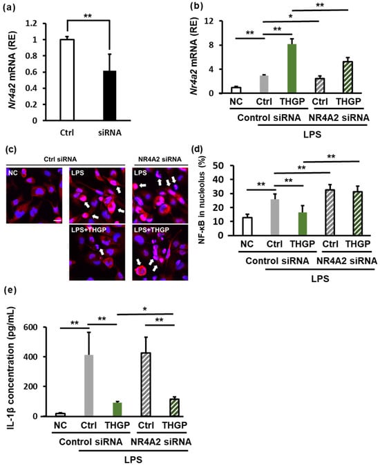 Analysis of the anti-inflammatory effects of THGP following NR4A2 knockdown. THP-1 cells were seeded and treated with 1 μM PMA for differentiation. After 24 h, the cells were treated with 5 mM THGP and transfected with siRNA. An additional 24 h later, 10 μg/mL LPS was added. The cells were then incubated for another 24 h, after which samples were collected. For IL-1β concentration measurement, the cells were stimulated with 1 mM ATP for 2 h. (a) qPCR verification of the NR4A2 knockdown efficiency. (b) Analysis of NR4A2 expression in cells treated with LPS (10 μg/mL), NR4A2 siRNA, and THGP (5 mM). (c) Images of immunofluorescence staining showing NF-κB localization (red) and nuclei (blue). The white arrows indicate NF-κB localized in the nucleus. Scale bar: 20 μm. (d) Quantification of the nuclear NF‒κB ratio. (e) ELISA measurement of IL-1β secretion from cells stimulated with LPS (10 μg/mL) and ATP (1 mM). The results are shown as the means ± SDs (n = 6). * p < 0.05 and ** p < 0.01 compared with the control.
