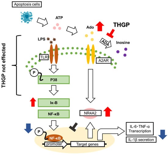 Schematic diagram of the mechanism of action of THGP against LPS-induced inflammation. THGP inhibits adenosine degradation by adenosine deaminase (ADA), leading to increased adenosine levels. Adenosine signaling activates NR4A2, which inhibits NF-κB nuclear translocation. Consequently, THGP suppresses IL-6 and TNF-α expression and IL-1β secretion. The blue arrows indicate a decrease due to THGP, while the red arrows indicate an increase due to THGP.
