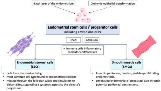 Endometrial stem cells (endometrial mesenchymal stem cells [eMSCs] and endometrial epithelial progenitors [eEPs]) play key roles in lesion establishment, possessing strong adhesive and proliferative properties. Altered integrin and cadherin expression enhances adhesion to peritoneal surfaces, while inflammation sustains lesion growth. Additionally, endometrial stromal cells (ESCs) and smooth muscle cells (SMCs) contribute to lesion heterogeneity, originating from basal endometrial layers or reactivated coelomic epithelium [1,2,3].