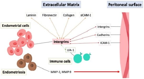 The adhesion of endometrial cells to the peritoneal surface is possibly mediated through interactions between cell adhesion molecules such as integrins, cadherins, and intercellular adhesion molecule-1 (ICAM-1), with integrins acting on endometrial cells to bind to extracellular matrix (ECM) proteins like laminin, fibronectin, and collagen, facilitating cell adhesion and migration [22]. Soluble intercellular adhesion molecule-1 (sICAM-1) is a soluble form of transmembrane glycoproteins in the extracellular environment and interacts with integrins and other adhesion molecules, particularly the leukocyte function-associated antigen-1 (LFA-1) integrin on immune cells to facilitate cell–cell adhesion and immune responses [23]. The aberrant expression of adhesion molecules, inflammation, or immune dysfunction in the peritoneal cavity can disrupt the balance between cell adhesion and invasion, contributing to the establishment and progression of endometriotic lesions, highlighting their importance in the disease process [24,25]. Furthermore, the endometrial cells in endometriosis secrete matrix metalloproteinases (MMPs), particularly MMP-2 and MMP-9, which act as enzymes that degrade the ECM and remodeling tissue, allowing for penetration and infiltration, increasing invasiveness into the surrounding tissues [26,27,28]. Figure 4 depicts the interaction of cell adhesion molecules between the endometrial cells, extracellular matrix, peritoneal surface, and immune cells.