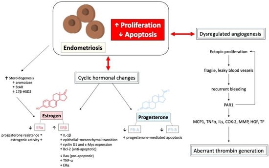 Cyclic hormonal changes in ectopic endometrial tissues and dysregulated angiogenesis, resulting in fragile, leaky blood vessels, both contribute to recurrent bleeding episodes in endometriotic lesions, potentially leading to aberrant thrombin generation. Thrombin generation from recurrent bleeding stimulates further endometriotic cell proliferation via protease-activated receptor 1 (PAR1), inducing downstream signaling expression of monocyte chemoattractant protein-1 (MCP1), tissue necrosis factor alpha (TNFα), various interleukins (IL), cyclooxygenase-2 (COX-2), matrix metalloproteinases (MMP), hepatocyte growth factor (HGF), and tissue factor (TF), potentially increasing the risk of thrombotic events [21,27,30,45,46,47,48,49,50]. Moreover, repetitive thrombin production often provokes local inflammation and fibrin aggregation, leading to aggravated adhesion formation and subsequent clinical symptoms in affected patients. The proliferation and apoptosis of endometriotic cells, mediated by the interactions of different hormones, cytokines, and tissue factors, is shown in Figure 5.