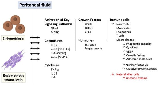 Additionally, as antigen-presenting cells to activate T cells, macrophages in the peritoneal fluid exhibit reduced phagocytic capacity but heightened production of proinflammatory cytokines such as tumor necrosis factor alpha (TNF-α), interleukin-1β, and interleukin-6, as well as proangiogenic factors like vascular endothelial growth factor (VEGF) with various growth factors and adhesion molecules [3,64,69]. This cytokine production is further amplified by the overexpression of nuclear factor κB (NK-κB) in peritoneal macrophages and endometriotic stromal cells, along with the generation of reactive oxygen species (ROS) and activation of mitogen-activated protein kinase (MAPK) signaling pathways [20,27,48,50,52,70].