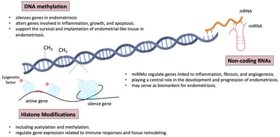 Epigenetic mechanisms play a crucial role in the development and progression of endometriosis, influencing gene expression without altering the underlying DNA sequence. These mechanisms include DNA methylation, histone modification, and non-coding RNAs, all of which can impact the pathophysiology of endometriosis. The epigenome can also be influenced by environmental factors, including social behavior, metabolism, and nutritional deficiencies [61,64,76,77].