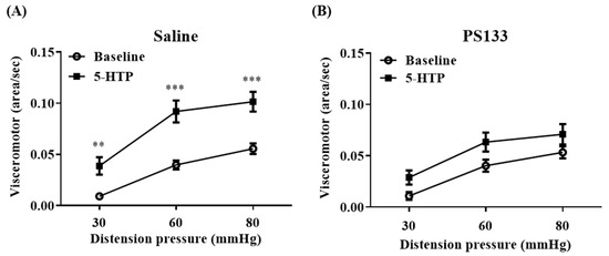 Effect of L. cremoris PS133 on 5-HTP-induced VH on experimental day 28. The visceromotor responses were recorded 30 min before (baseline) and after the injection of 5-HTP to (A) the Saline group and (B) PS133. ** p < 0.01; *** p < 0.001, compared with the baseline by repeated two-way ANOVA with Bonferroni correction.