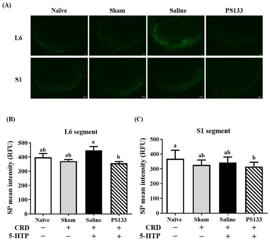 SP is a neurotransmitter associated with the transmission of pain information to the spinal cord and brain [26]. A previous study revealed that visceral pain signals in CRD-treated mice are primarily transmitted to the L6-S1 segments of the spinal cord [27]. To further confirm the effect of PS133 on 5-HTP-induced VH, we performed immunofluorescence staining to measure SP levels in the L6-S1 segments of the spinal cord. Figure 2A illustrates SP immunoreactivity in the L6 and S1 segments in all four groups. In the L6 segment, weaker SP immunoreactivity was observed in the Naïve and Sham groups; however, stronger SP immunoreactivity was observed in the Saline group (Figure 2B). Notably, the intensity of SP-immunoreactive fibers in the L6 spinal cord was significantly lower in the PS133 group than in the Saline group (Figure 2B, p < 0.05). In the S1 segment, we did not observe stronger SP intensity in the Saline group. A similar result was noted in the S1 segment: PS133 administration decreased 5-HTP-induced SP immunoreactivity, with the intensity even lower than in rats in the Naïve group (Figure 2C, p < 0.05). Collectively, these observations suggest that L. cremoris PS133 substantially decreases SP levels in rats with 5-HTP-induced VH.