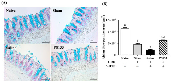 Mucins are major components of the colonic mucus barrier [20,28]. To investigate whether PS133 supplementation affects mucin expression in the rat model of 5-HTP-induced IBS, we performed alcian blue staining to analyze mucin production in the distal colon of rats. Mucins were detected on the surface of the colonic epithelium. The mucin-containing areas were stained, counted, and normalized to the positive area of the tissue (Figure 3A). Figure 3B illustrates the stained areas and reveals that compared with the Naïve group, the colonic mucin amounts were significantly decreased in three CRD-treated groups, suggesting CRD causes mucosal damage in the gut. Accordingly, a smaller positive colonic mucin area was observed in the Saline group compared with the Sham group. This suggests that 5-HTP injection damages the intestinal mucosal barrier. Interestingly, PS133 supplementation markedly restored the 5-HTP-induced changes in colonic mucin expression. Furthermore, the mucin-containing area was significantly larger in the PS133 group than in the Sham group (Figure 3B, p < 0.05).