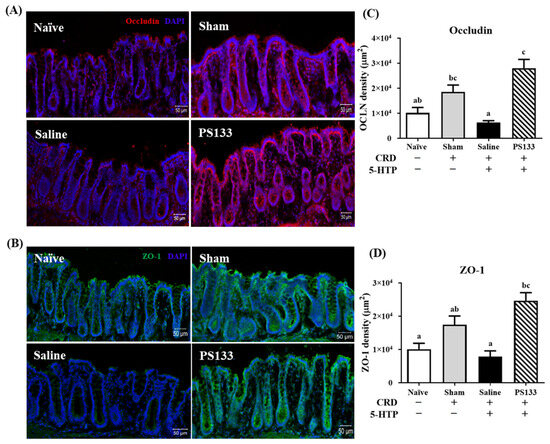 A previous study revealed a positive correlation between increased intestinal epithelial permeability and VH in patients with IBS [29]. Tight junction proteins such as occludin and ZO-1 maintain the intestinal barrier and regulate ion, nutrient, and water permeability [30]. To assess intestinal permeability, we analyzed the intensities of occludin and ZO-1 in the colonic mucosa using immunofluorescence staining. As shown in Figure 4A,B, the network of occludin (red) and ZO-1 (green) was predominantly intact and localized along the apical cellular border in both the Naïve and Sham groups. The Sham group even exhibited higher intensities of occludin and ZO-1 than the Naïve group (Figure 4C,D), suggesting that CRD treatment stimulates tight junction protein expression. However, compared with the Sham group, the intensities of the occludin and ZO-1 proteins were significantly lower in the Saline group (Figure 4C,D, p < 0.05). Importantly, 14 days of PS133 supplementation elevated occludin and ZO-1 levels in 5-HTP-induced IBS model rats. Figure 4C,D illustrate that the intensities of the occludin and ZO-1 proteins were significantly higher in the PS133 group than in the Saline group, which was not supplemented with PS133. Collectively, these data suggest that L. cremoris PS133 supplementation promotes the appropriate expression and distribution of tight junction proteins.