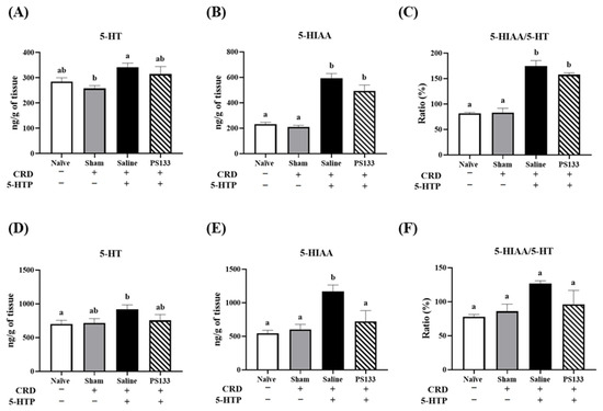 5-HTP is a precursor of 5-HT and 5-HIAA. As previously reported, 5-HTP injection significantly affects the 5-HIAA/5-HT ratio in the prefrontal cortex and hypothalamus; interestingly, probiotic supplementation has been shown to restore this balance [18]. Therefore, to investigate the effects of PS133, we harvested the prefrontal cortex and hypothalamus and measured the 5-HT and 5-HIAA levels via HPLC. In the prefrontal cortex, 5-HT and 5-HIAA levels were comparable in the Naïve and Sham groups; this suggests that CRD does not alter 5-HT or 5-HIAA levels (Figure 5A,B). However, after 5-HTP injection, 5-HT and 5-HIAA levels significantly increased in the Saline group (Figure 5A,B, p < 0.05). In contrast, 5-HT and 5-HIAA levels, even the 5-HIAA/5-HT ratio, were slightly reversed in the PS133 group with no statistically significant difference (Figure 5A–C). In the hypothalamus, no significant differences were observed in 5-HT levels among the four groups (Figure 5D). However, in the Saline group, the 5-HIAA level was higher in the hypothalamus, significantly increasing the 5-HIAA/5-HT ratio (Figure 5E,F, p < 0.05). After L. cremoris PS133 supplementation, the 5-HIAA level was reversed in the PS133 group; however, the difference was not statistically significant (Figure 5E). Therefore, the 5-HIAA/5-HT ratio was significantly higher in the hypothalamus of the Saline group than in that of the Naïve and Sham groups (Figure 5F, p < 0.05).