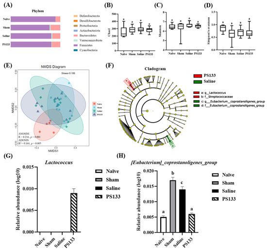 Effects of L. cremoris PS133 on gut microbiota composition. (A) Relative abundance of bacteria at the phylum level. Box plot showing the α-diversity in all groups: a comparison of bacterial diversity across sample groups in (B) the Chao1 index, (C) Shannon’s diversity index, and (D) Simpson’s evenness. Each bar represents the mean ± standard deviation. (E) A non-metric multidimensional scaling (NMDS) plot based on Bray–Curtis dissimilarity illustrating the β-diversity of gut microbiota among all groups. (F) LEfSe analysis of intestinal flora between the Saline group and PS133 group. Comparison of relative abundances of the (G) Lactococcus and (H) [Eubacterium]_coprostanoligenes_group level among all groups. Data were expressed as mean ± S.E.M and analyzed by one-way ANOVA with Tukey’s post hoc test. Different letters (a, b and c) above the bars indicate statistically significant differences at p < 0.05.