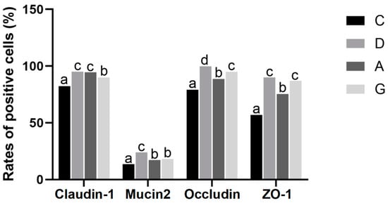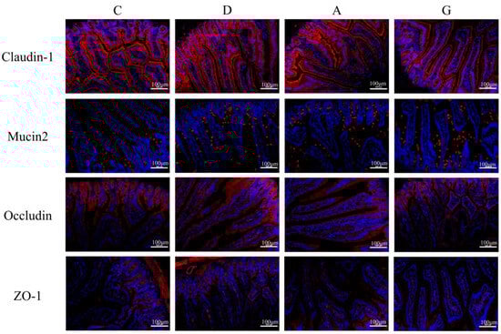 After being deparaffinized, washed and dried, paraffin slices were dyed with fluorescent quenching reagent for 5 min and then washed with water for 10 min. Following this, primary antibodies including Claudin-1 (1:3000), Mucin2 (1:3000), Occludin (1:200) and ZO-1 (1:200, Servicebio, Wuhan, China) were added, and the slices were incubated overnight at 4 °C. The slices were treated with fluorescent secondary antibodies in the dark for 1 h. Subsequently, the slices were washed and decolorized in phosphate-buffered saline (PBS, pH = 7.4) on a slide shaker three times, each for 5 min. The slices were lightly dried and then treated with DAPI solution, followed by incubating at room temperature for 10 min and washing with PBS three times. After shaking the slices dry, a quench-resistant seal sheet with a fluorescent agent was applied. Once the slices were slightly dried, images were observed and captured under a fluorescence microscope. Image-Pro Plus 6.0 analysis software was utilized to calculate the positive area density (IOD/Area).