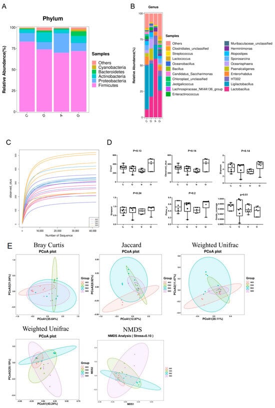 The IBM SPSS Statistics (26.0, SPSS Inc., Chicago, IL, USA) was employed to analyze the data. One-way analysis of variance was utilized to examine the changes in Alpha diversity indices and the abundances of dominant microbiota at the phylum, order, family and genus levels among groups. Moreover, Duncan’s multiple comparison test was applied to compare the significance of differences in each index. During the LEfSe analysis of the differences in gut microbiota abundances between two groups, the Kruskal–Wallis rank sum test was used to compare the differences of microbiota among different taxonomic levels between groups, and the LDA score was adopted to evaluate the degree of influence. When p < 0.05 and LDA score > 3.0, it was considered that there was a significant difference in the abundances of microbiota between groups. For the relevant data of ELISA, mRNA and Western Blot, prior to statistical analysis, all the obtained data were first subjected to the Kolmogorov–Smirnov test for normality distribution. After confirming that all the data in this experiment conformed to the normal distribution, multivariate analysis of variance under the general linear model was used to analyze the data between treatment groups, and Duncan’s multiple test was utilized to compare the differences between treatment groups. The results were expressed as mean ± standard deviation (mean ± SD). p < 0.05 was regarded as statistically significant.