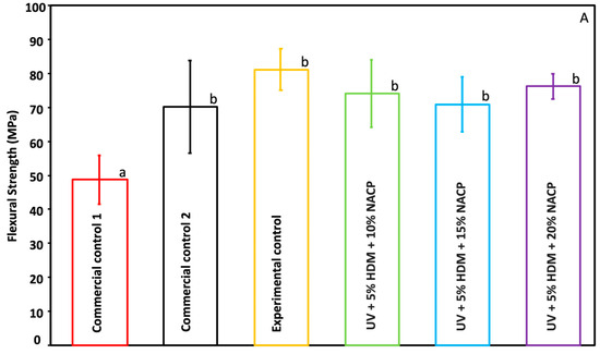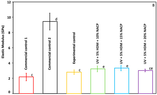 Mechanical properties of commercial controls 1 and 2, experimental control, and experimental groups: (A) Flexural strength and (B) Elastic modulus (mean ± SD; n = 7). Different letters indicate statistically significant differences between the groups (p < 0.05).
